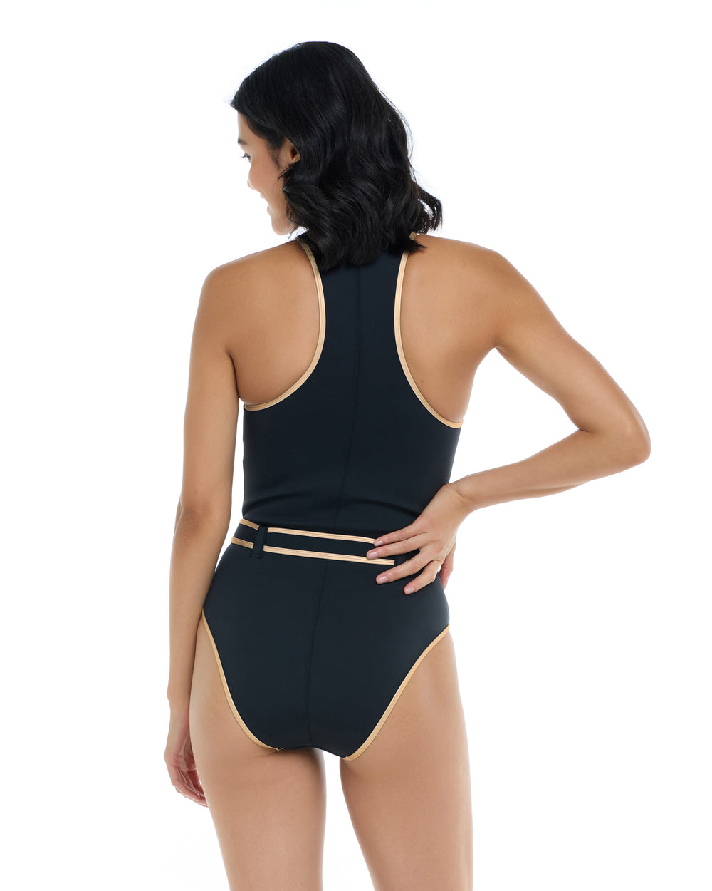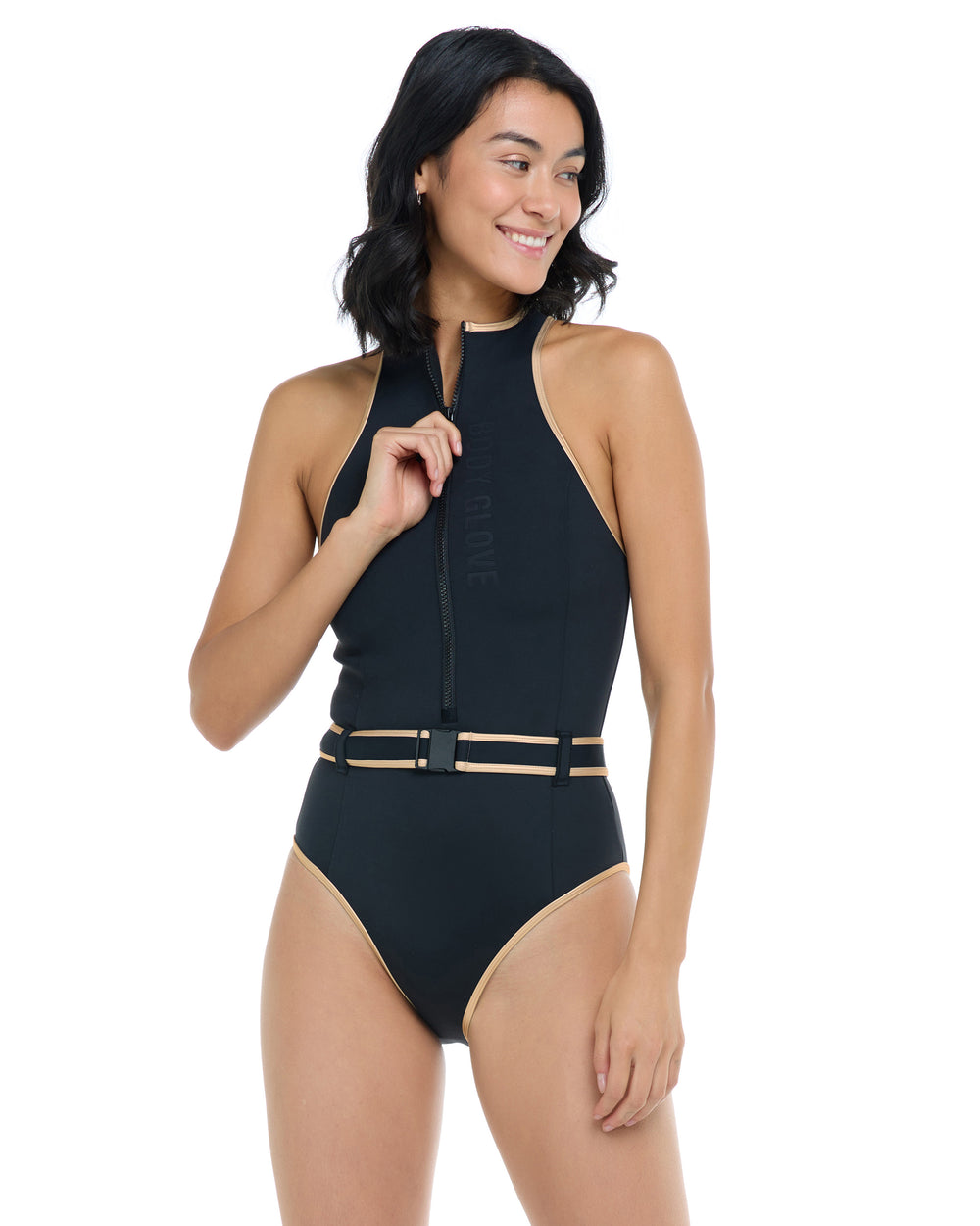 FINAL SALE, NO RETURNS Explore the power of minimalism with our Undersea print, an embodiment of style with a tactile touch. Available in two mesmerizing colorways: the first, a timeless union of black and gold, exudes sophistication. The second, in hot pink and pure white, is lighthearted with a sprinkle of playfulness. Whether you’re lounging by the pool or making waves at a beach party, this collection elevates your wardrobe with its captivating charm. Zip it up, belt it out—Express Yourself comes with a zip front and a removable belt, giving you endless ways to style your seaside look. And hey, the embossed logo adds that extra touch of sass! It’s your go-to for beach confidence with just the right amount of coverage for your water adventures. One-piece High neck Short stand collar Zip front Removable belt Embossed logo Neoprene